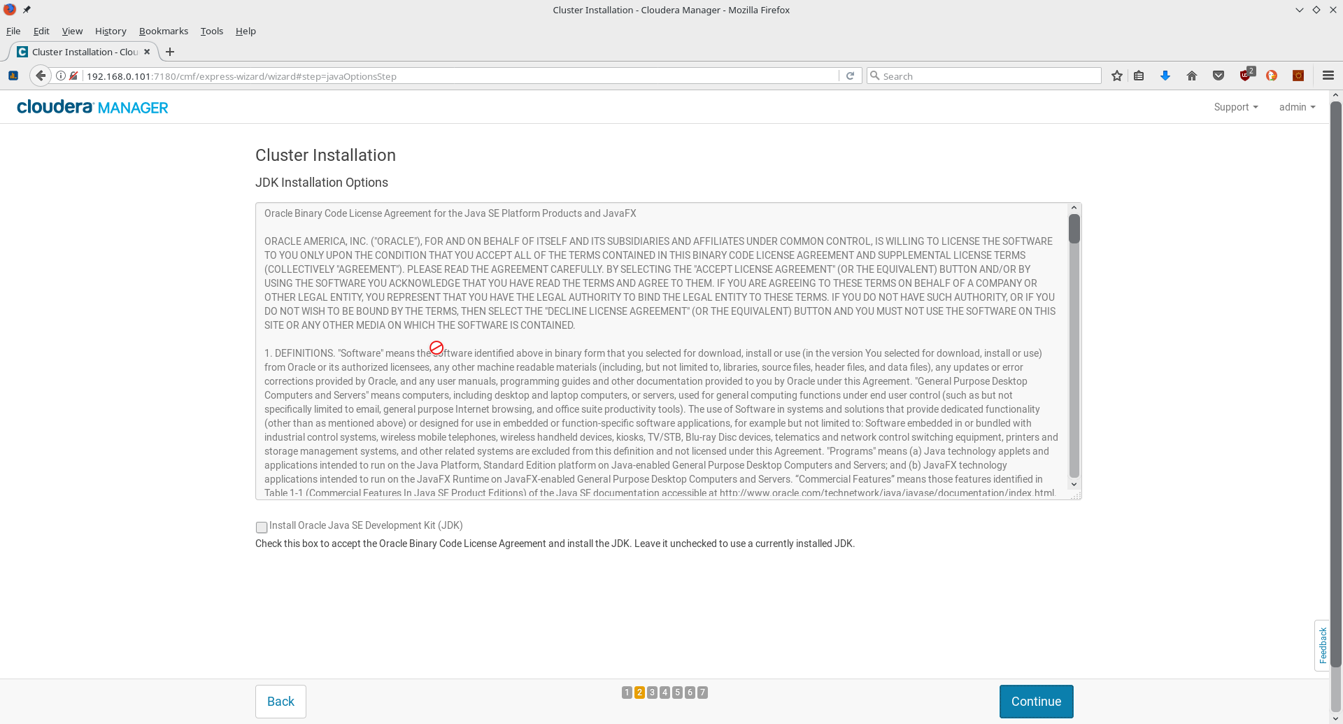 password: adminEn la siguiente página se aceptan los términos y condiciones del software y se da clic en el botón Continue: