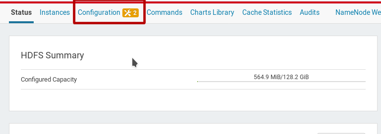 Uno de los servicios instalados, Hadoop File System (HDFS), como forma predeterminada tiene un factor de replicación de tres para respaldar toda la información guardada, lo que significa que cada parte de los archivo guardados en el HDFS estará en tres nodos diferentes. Como en este caso solo se tiene un nodo se debe configurar el factor de replicación a 1. Para esto se da clic en HDFS: