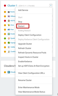 Luego se reinicia el cluster. Dentro del panel de administración de Cloudera Manager se despliegan las opciones del cluster y se da clic en Restart: